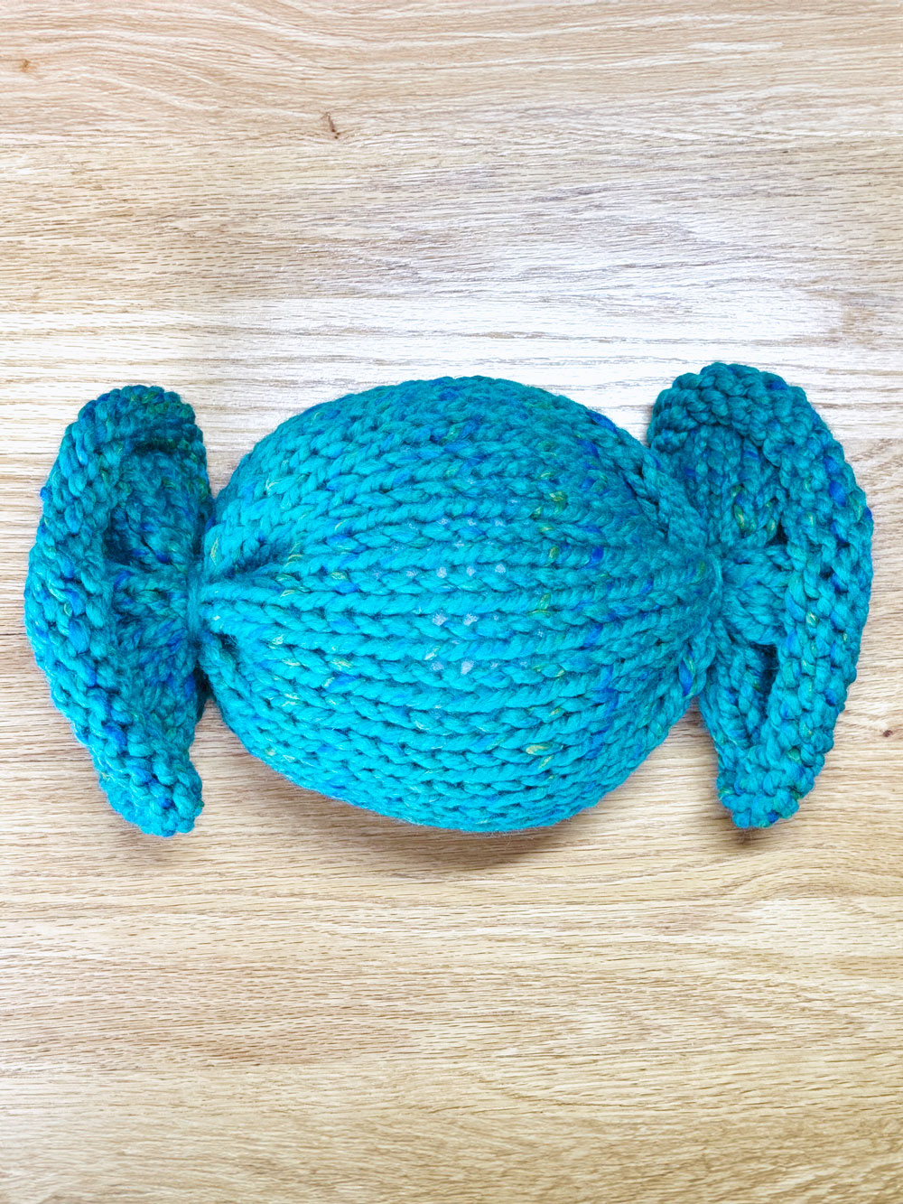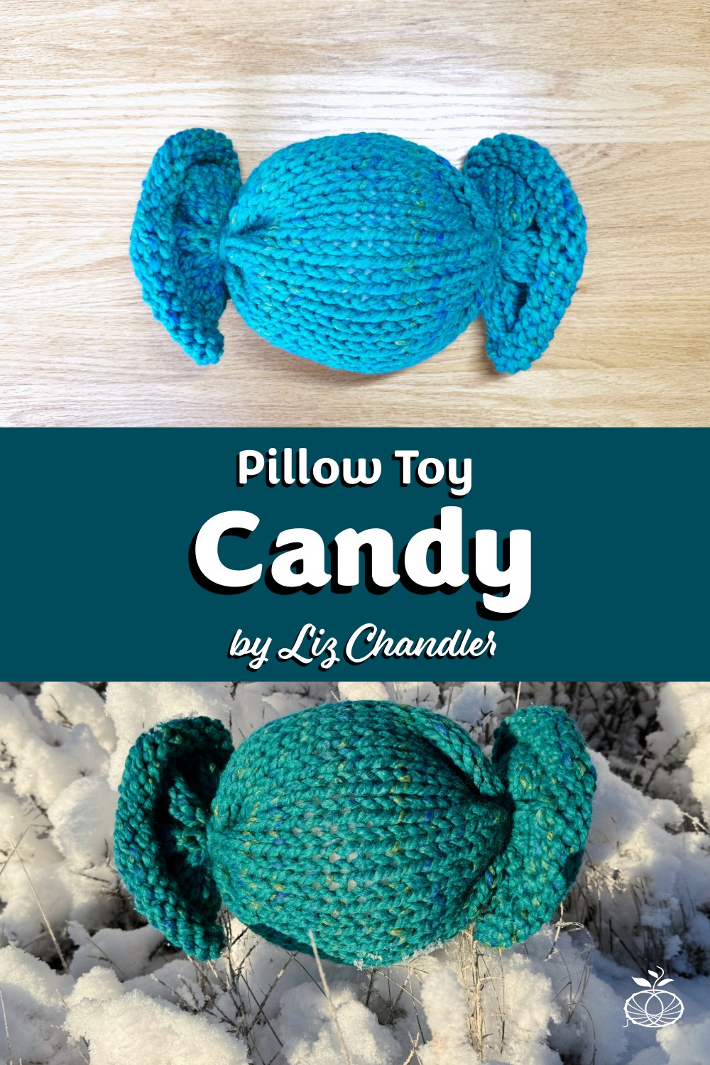 This candy-shaped knit toy pillow is worked as a simple tube using super-bulky yarn. After knitting, the tube is stuffed and the ends are tied closed with string, making this a fun, approachable project that feels complete without complicated steps.